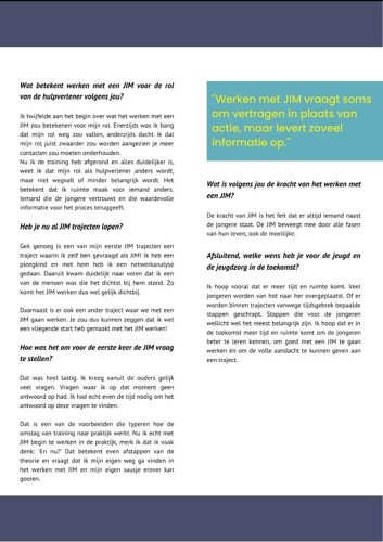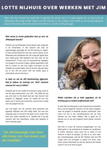 JIM staat voor Jouw Ingebrachte Mentor en is een familielid, vriend of bekende van de jongere en treedt op als ambassadeur en vertrouwenspersoon voor de jongere. Lotte Nijhuis, jeugdzorgwerker bij Pactum, vertelt over het werken met JIM in een interview met JIM werkt.